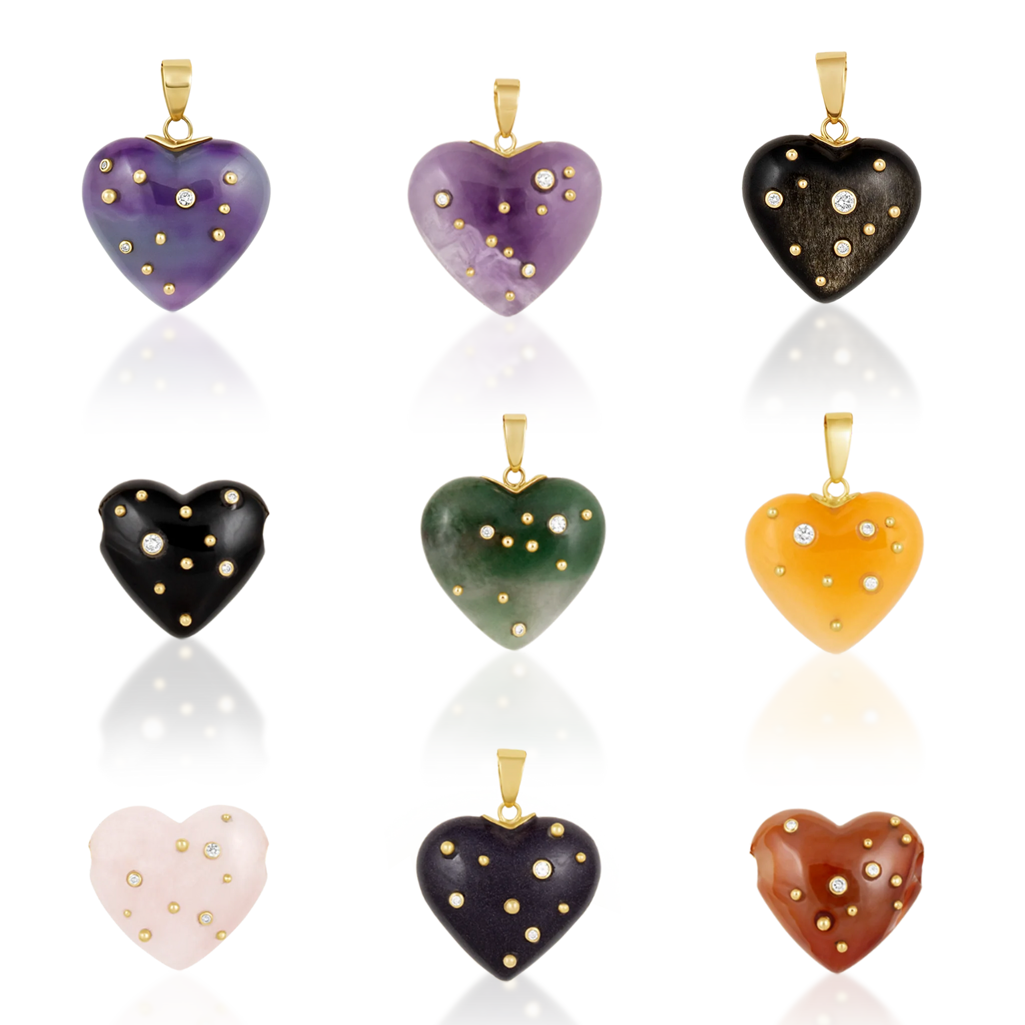 - Hand-carved amethyst studded heart with gold balls and VS+ manmade diamonds (one 2.5mm, two 1.5mm); gold cap, bail and heart on back; 1.25" x 1.5" x .5" - dark purple / Br918