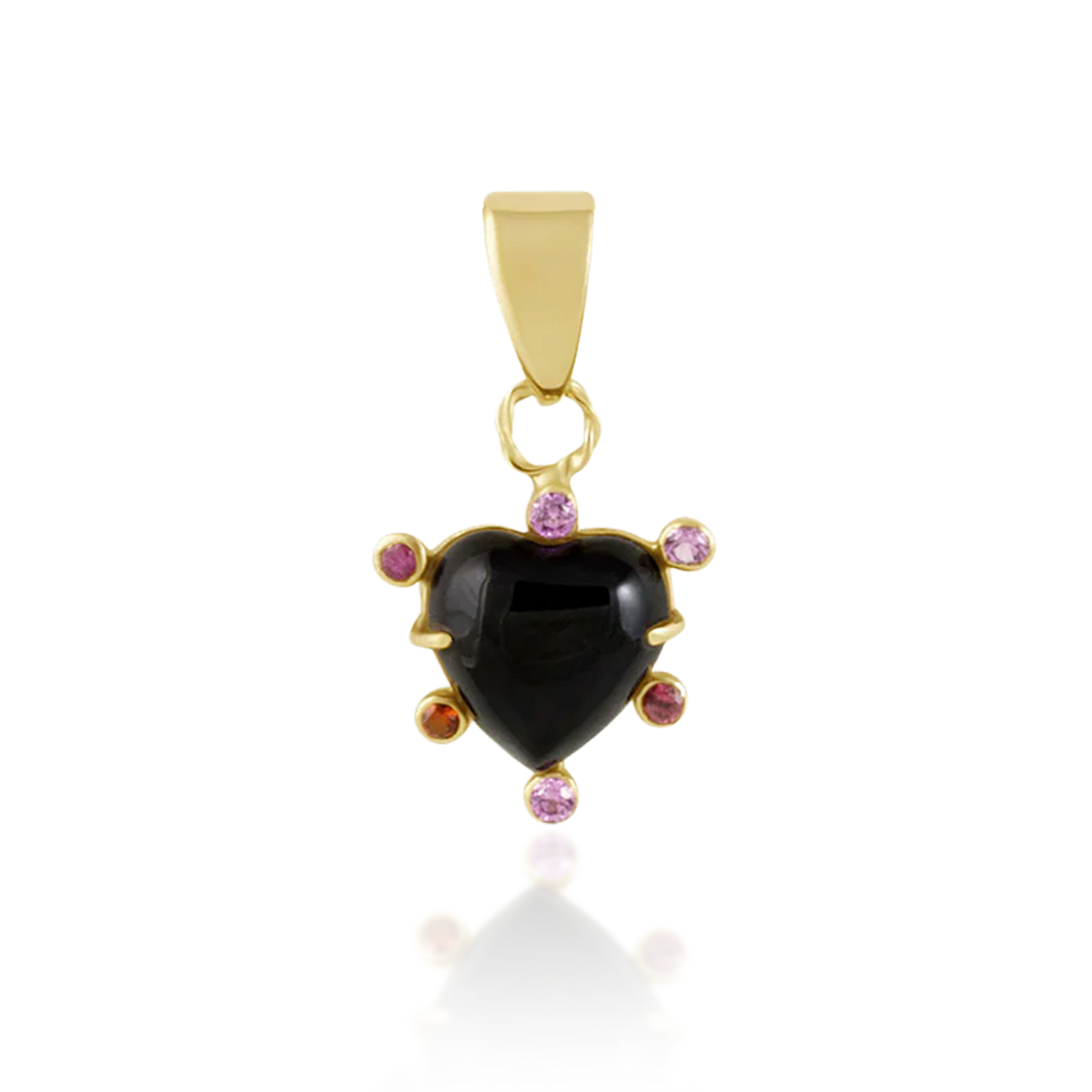 This tiny black onyx heart features a halo of pink sapphire and tourmaline with gold backing and handmade bail. This piece measures 1" x .5".