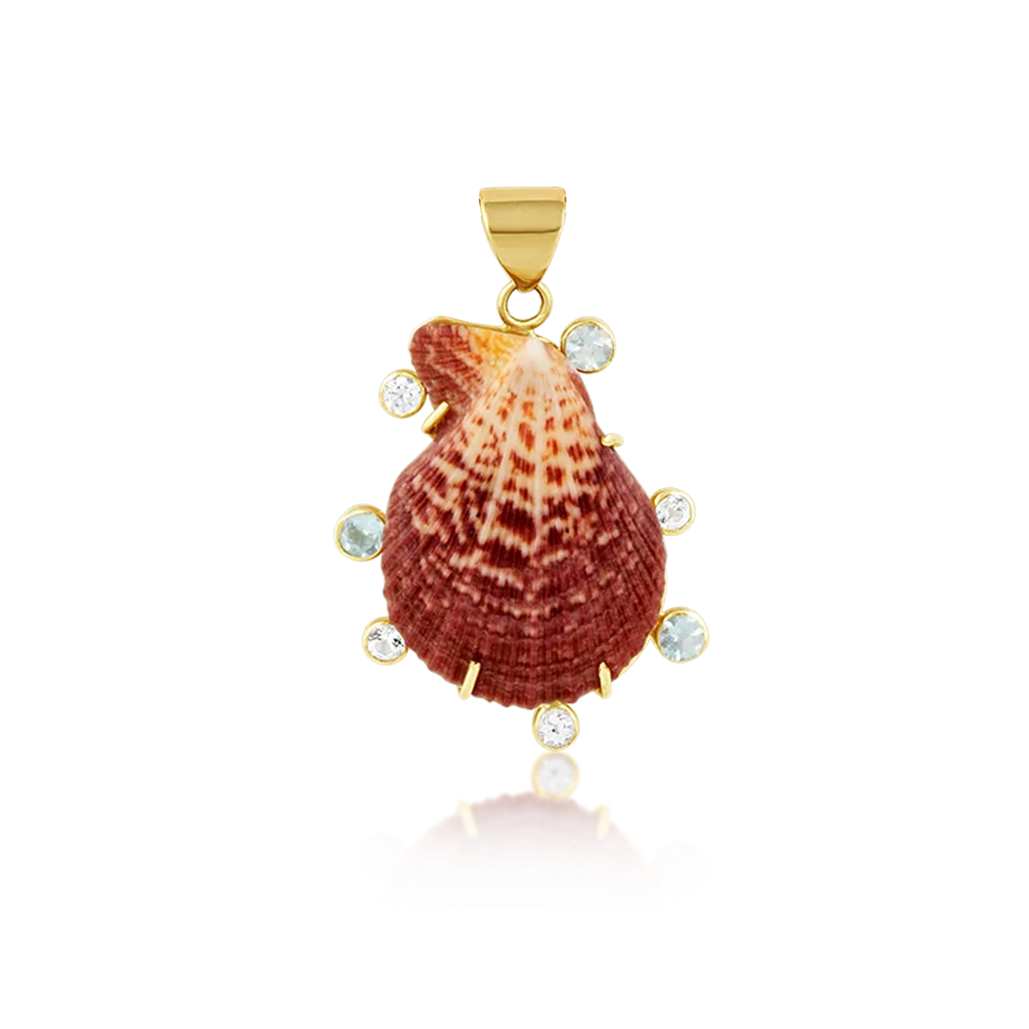 This brown clam shell features four white topaz and three aquamarine stones with full gold backing and handmade bail.