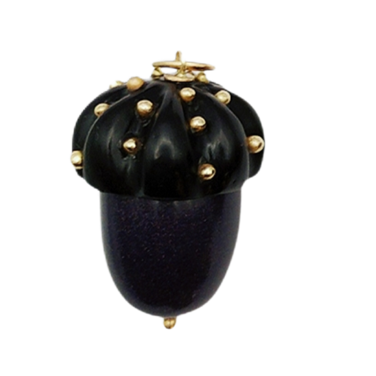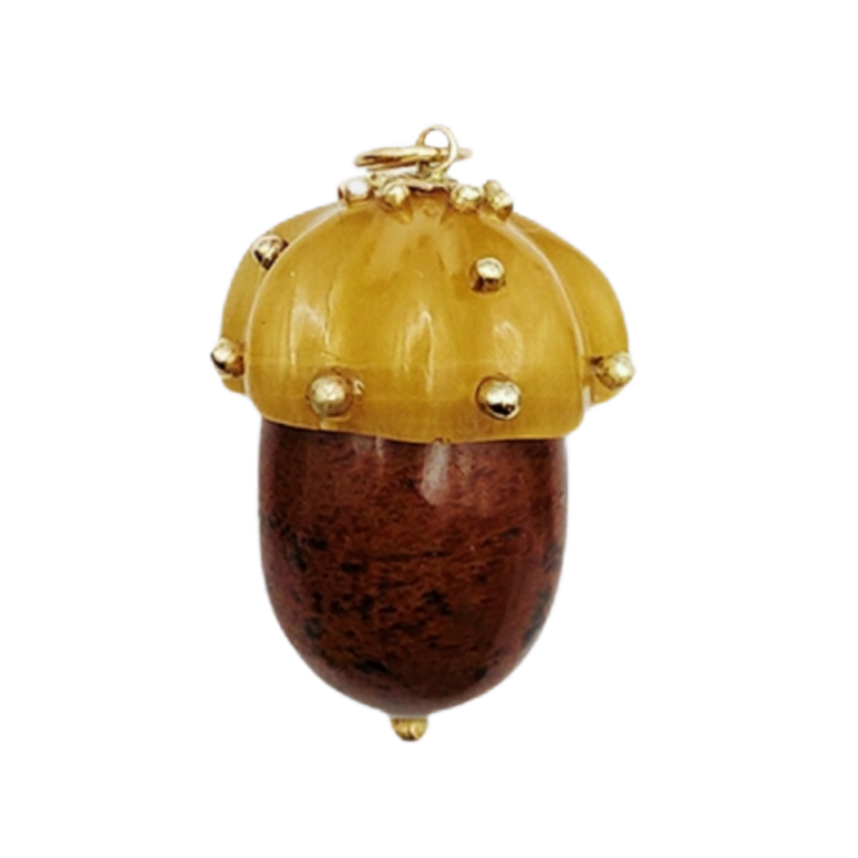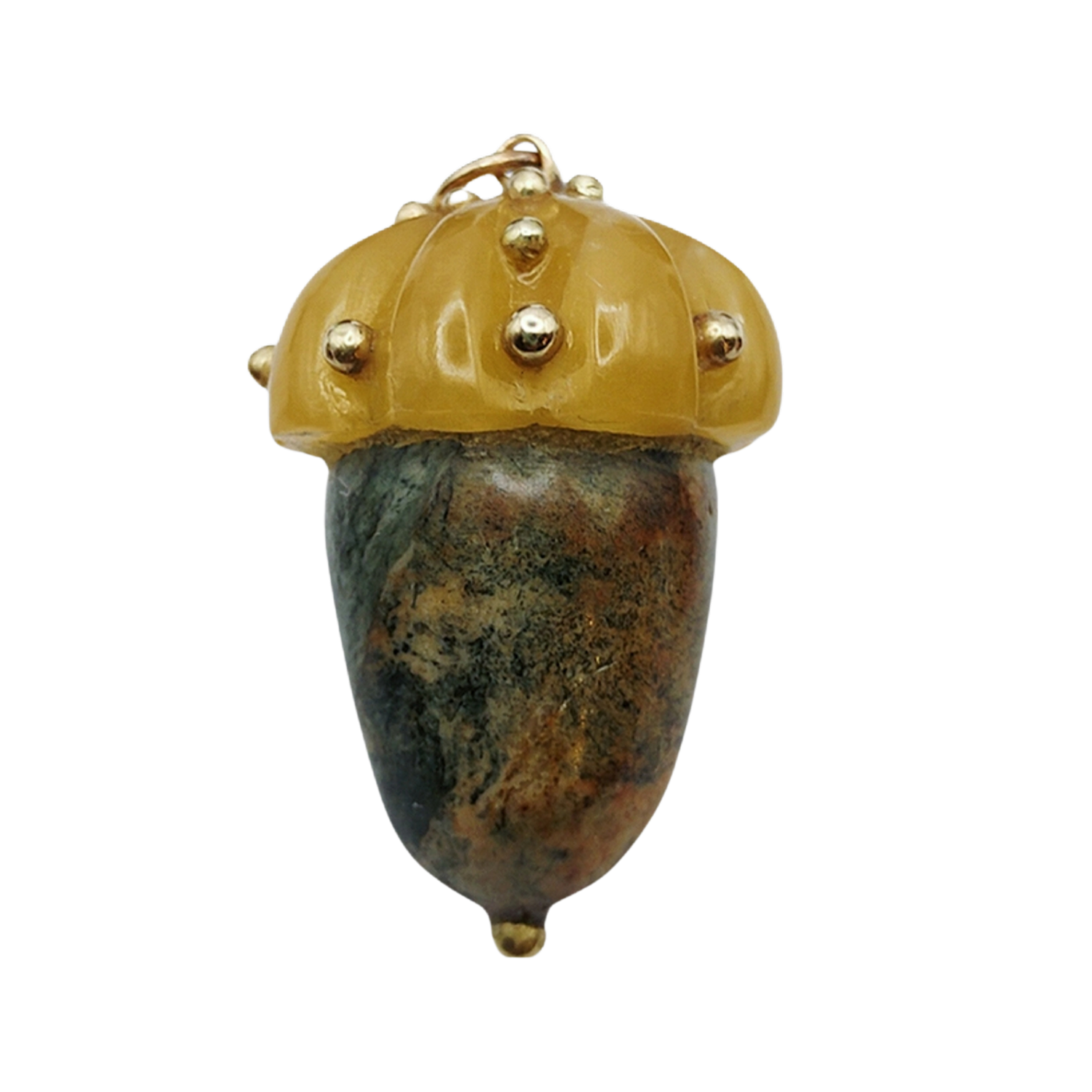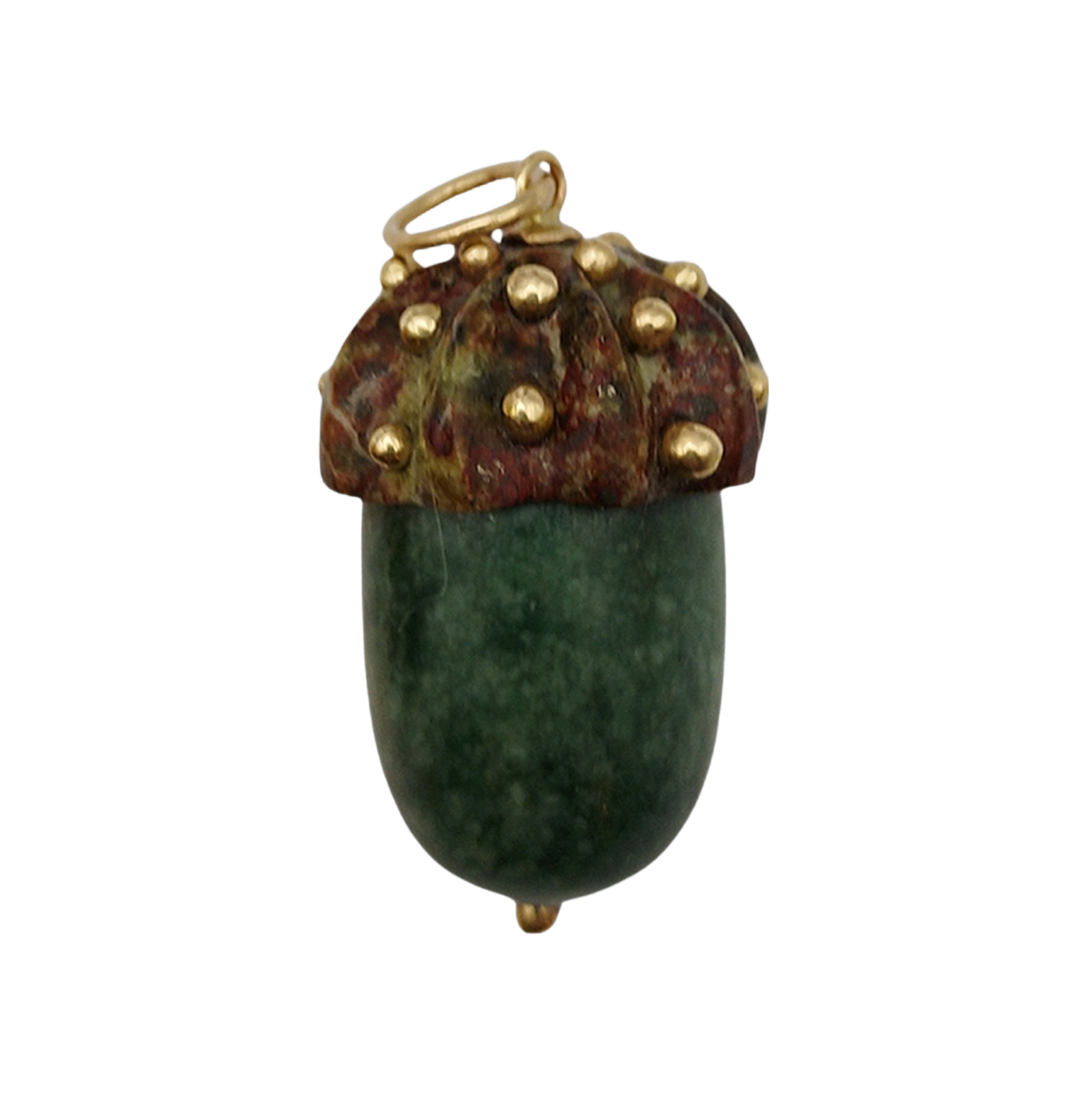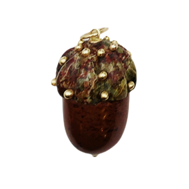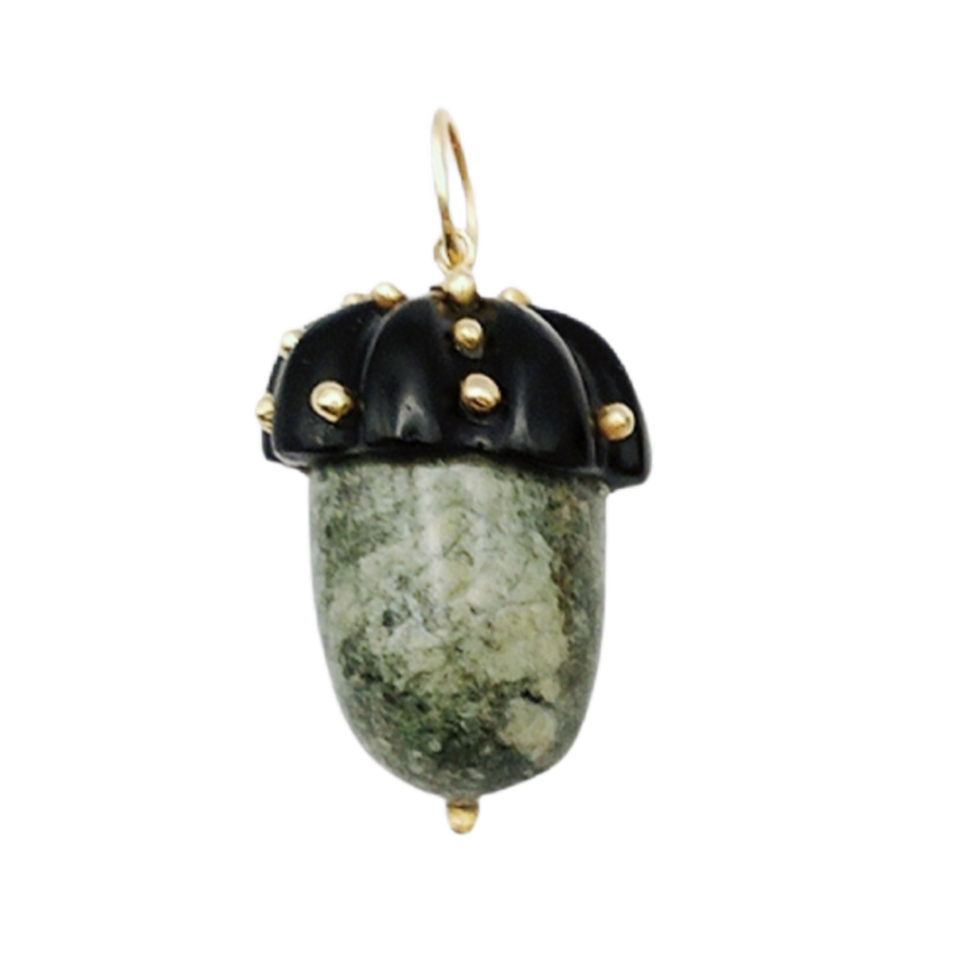 Hand-carved acorns in various stone combinations with gold balls and wire details; approximately 1.5” x 0.75”
