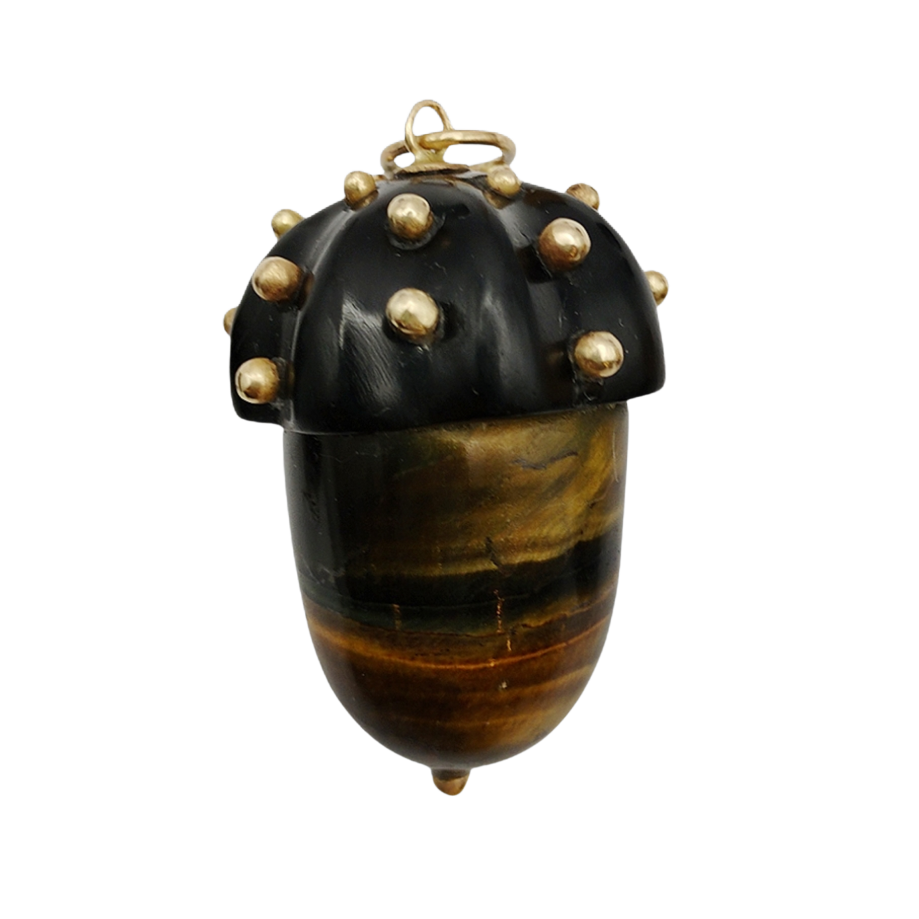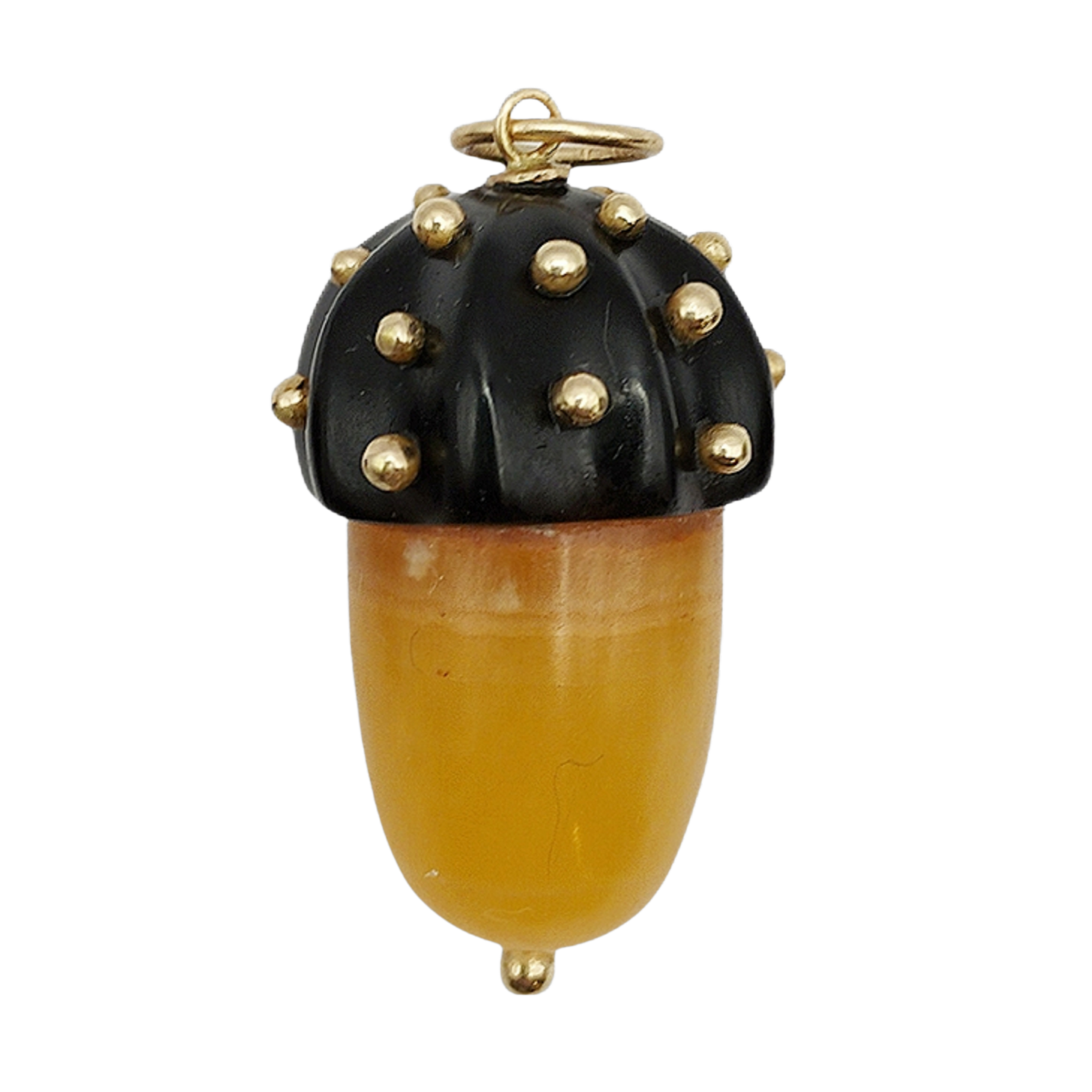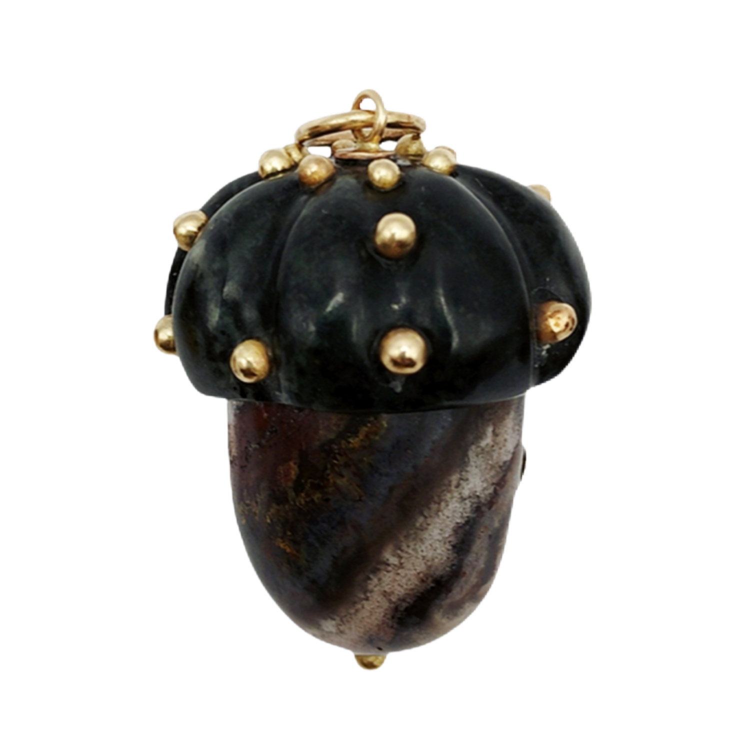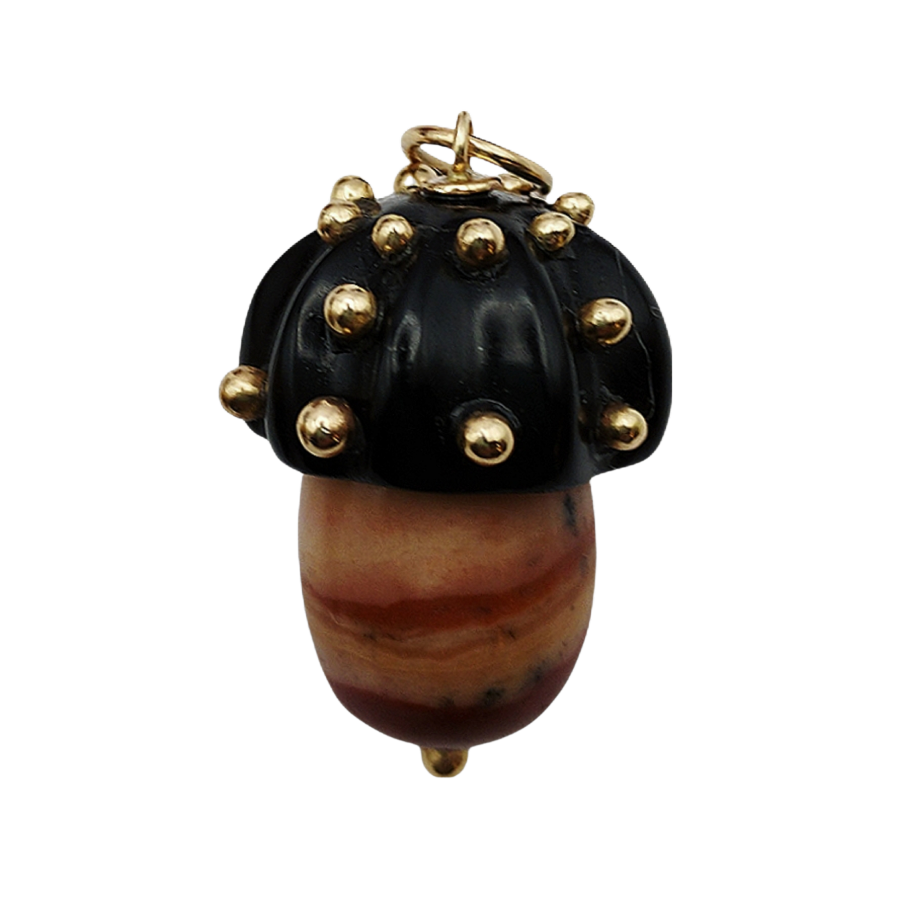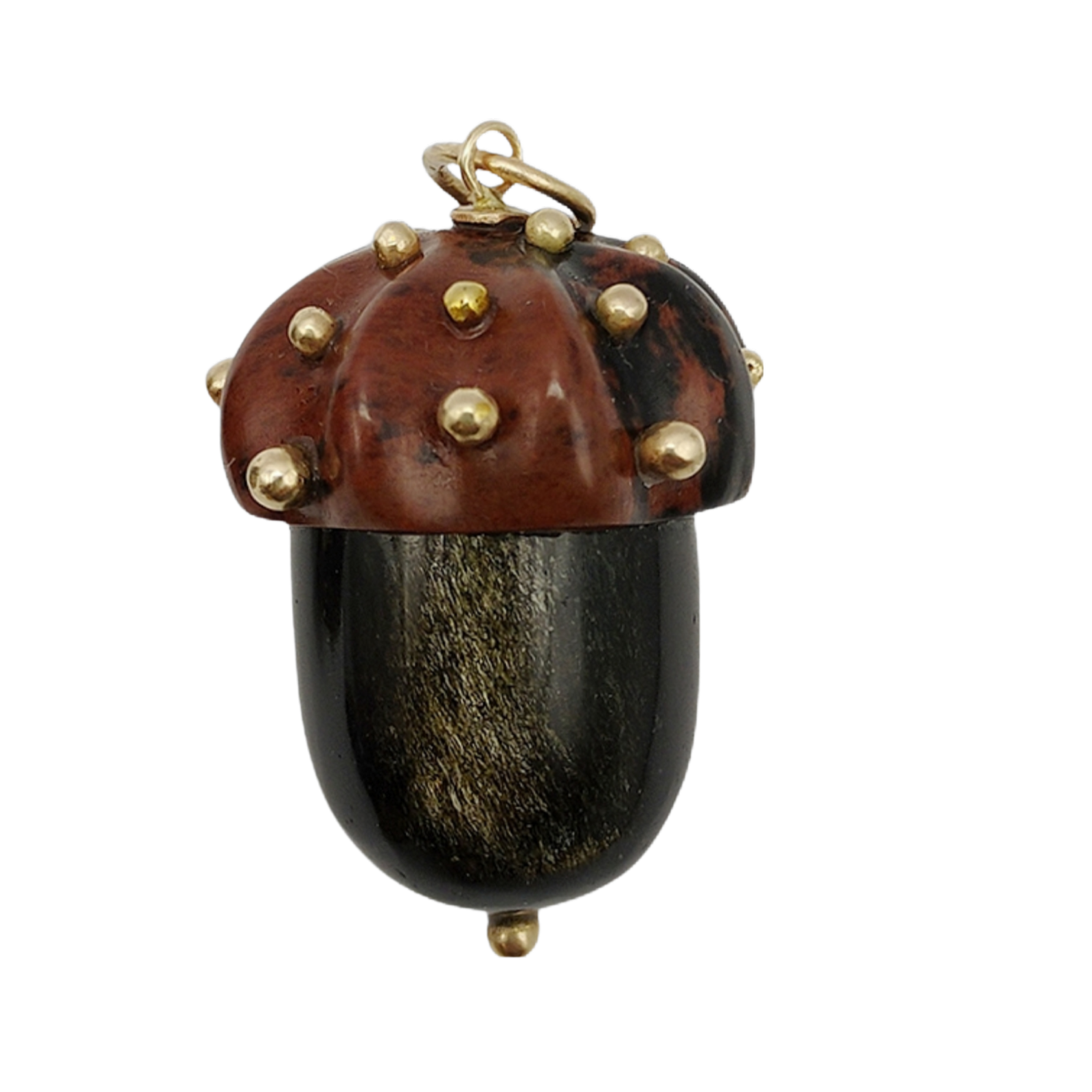 Hand-carved acorns in various stone combinations with gold balls and wire details; approximately 1.5” x 0.75”