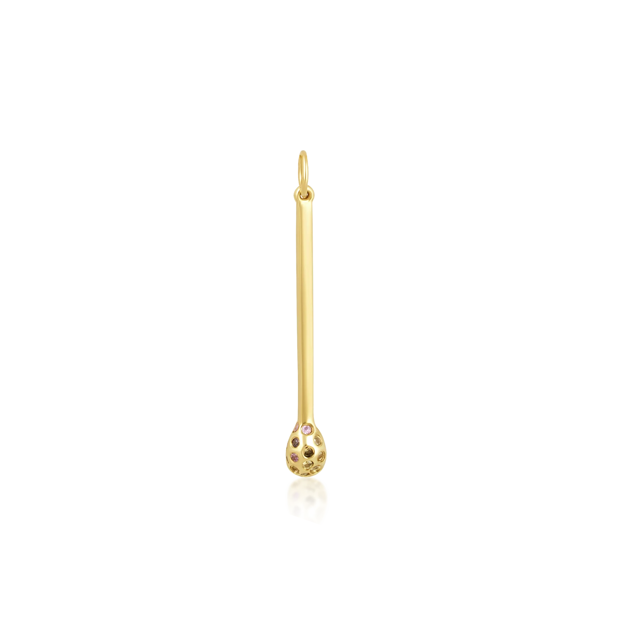 Matchstick made from solid 14k yellow gold and adorned with tiny colored gemstones. Pendant only - to purchase our 14k gold beaded chains, click here.