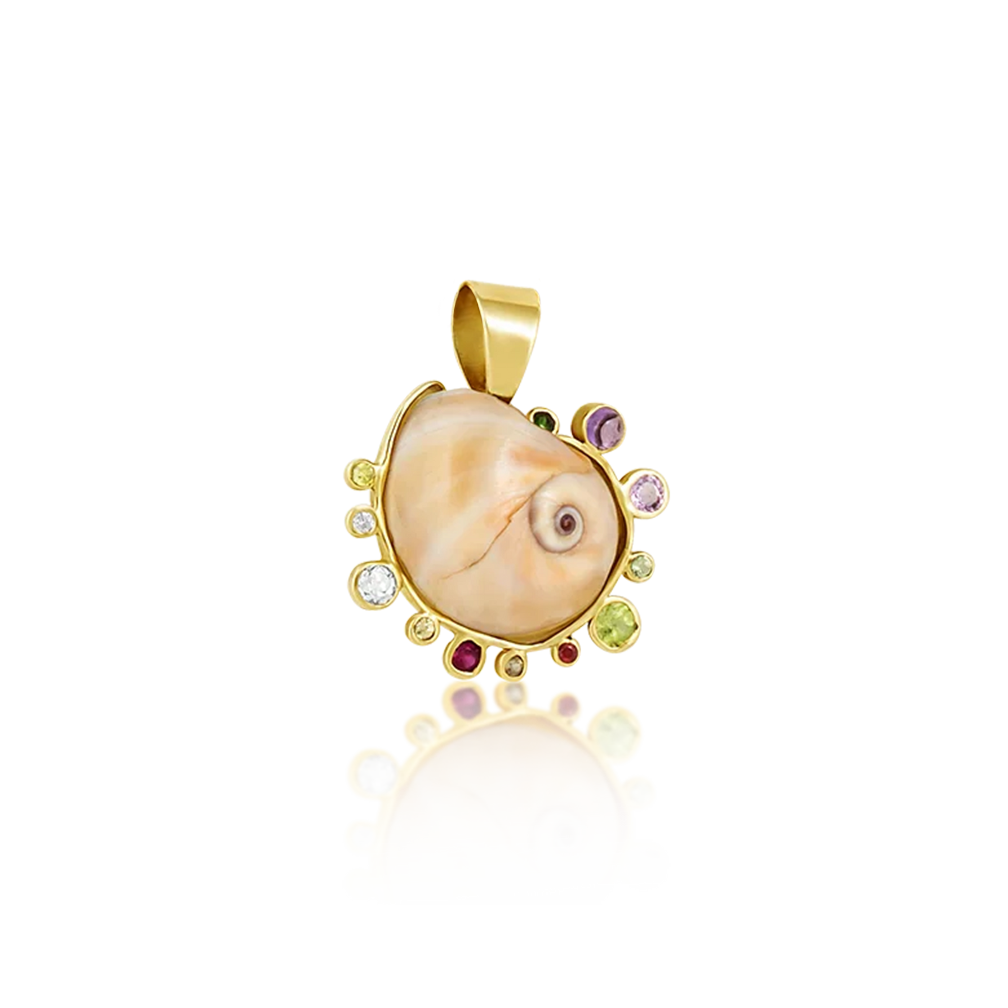 Spiral shell with pink sapphire, peridot, amethyst, emerald, ruby, white topaz, and white sapphire; handmade bail and heart on back; 1” x 1”