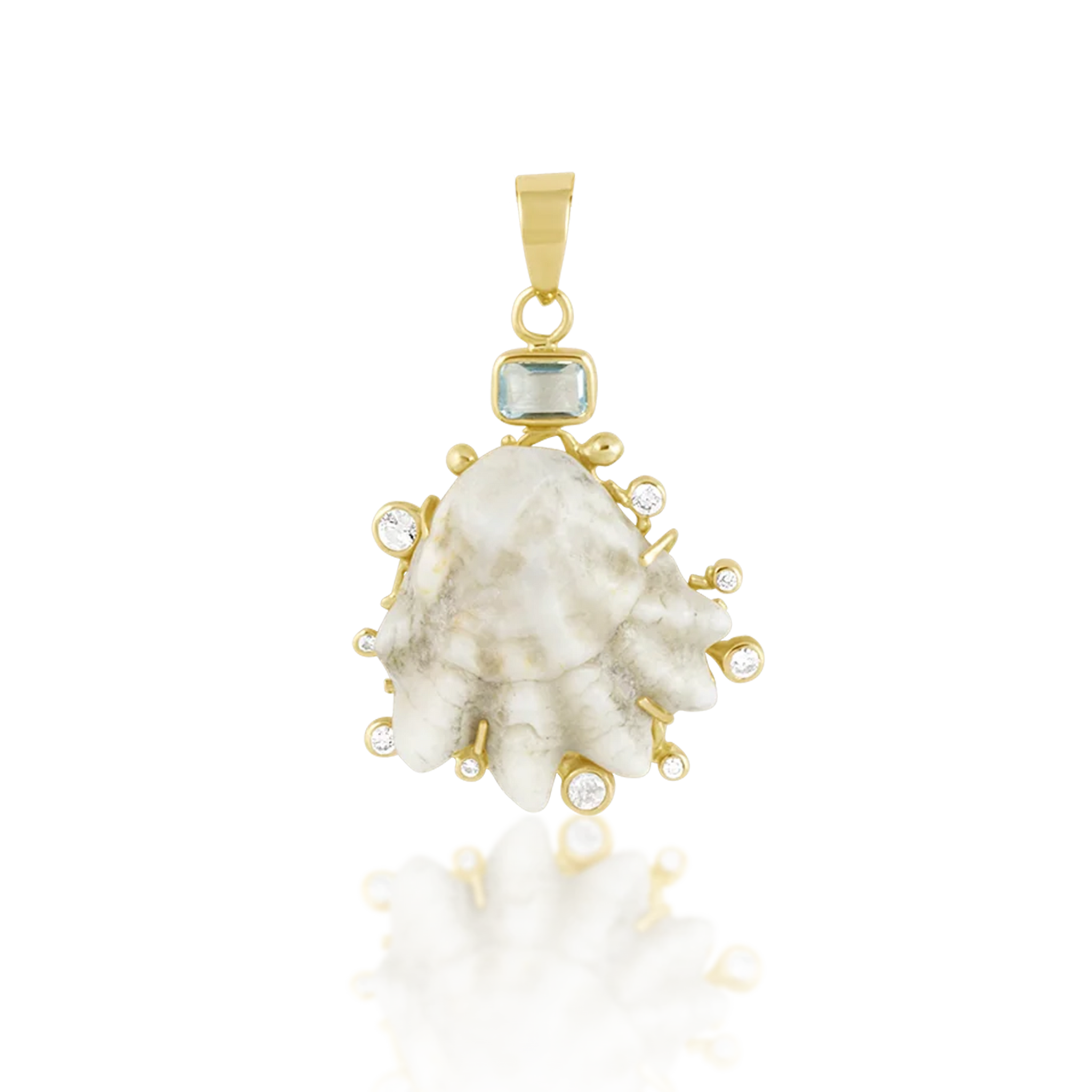 White kitten paw with halo of one 4x6mm emerald cut aquamarine in handmade setting, three 2.25mm VS+ man-made diamonds, three 1.75mm VS+ man-made diamonds, one 3mm white topaz, one 3mm aquamarine; gold heart lattice backing; triangle bail; 1" x 1.5"