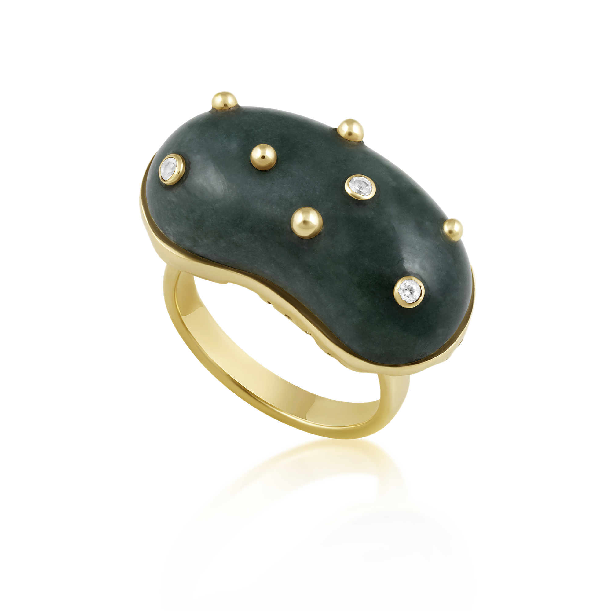 Carved jade bean studded with gold balls and three 1.75mm natural white sapphires (0.06 TCW); gold heart lattice on back; size 7.5; 3mm band; bean measures 1" x 0.5"