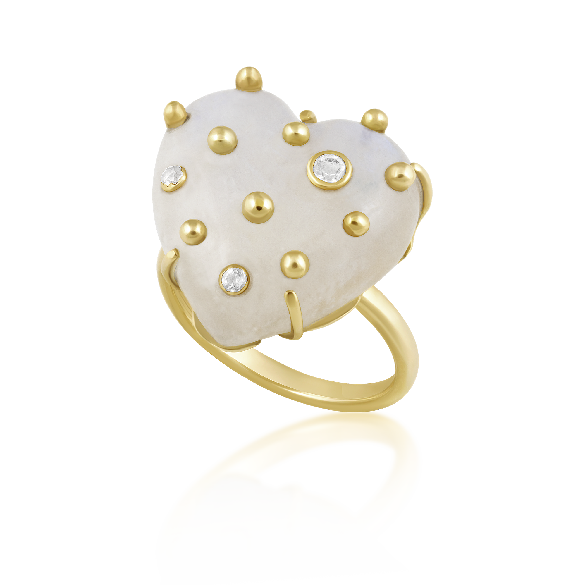 Hand-carved moonstone heart studded with gold balls and natural white sapphires (one 2.5mm, two 1.75mm - 0.11 TCW); gold heart lattice backing; size 7.5; 1" x 1"