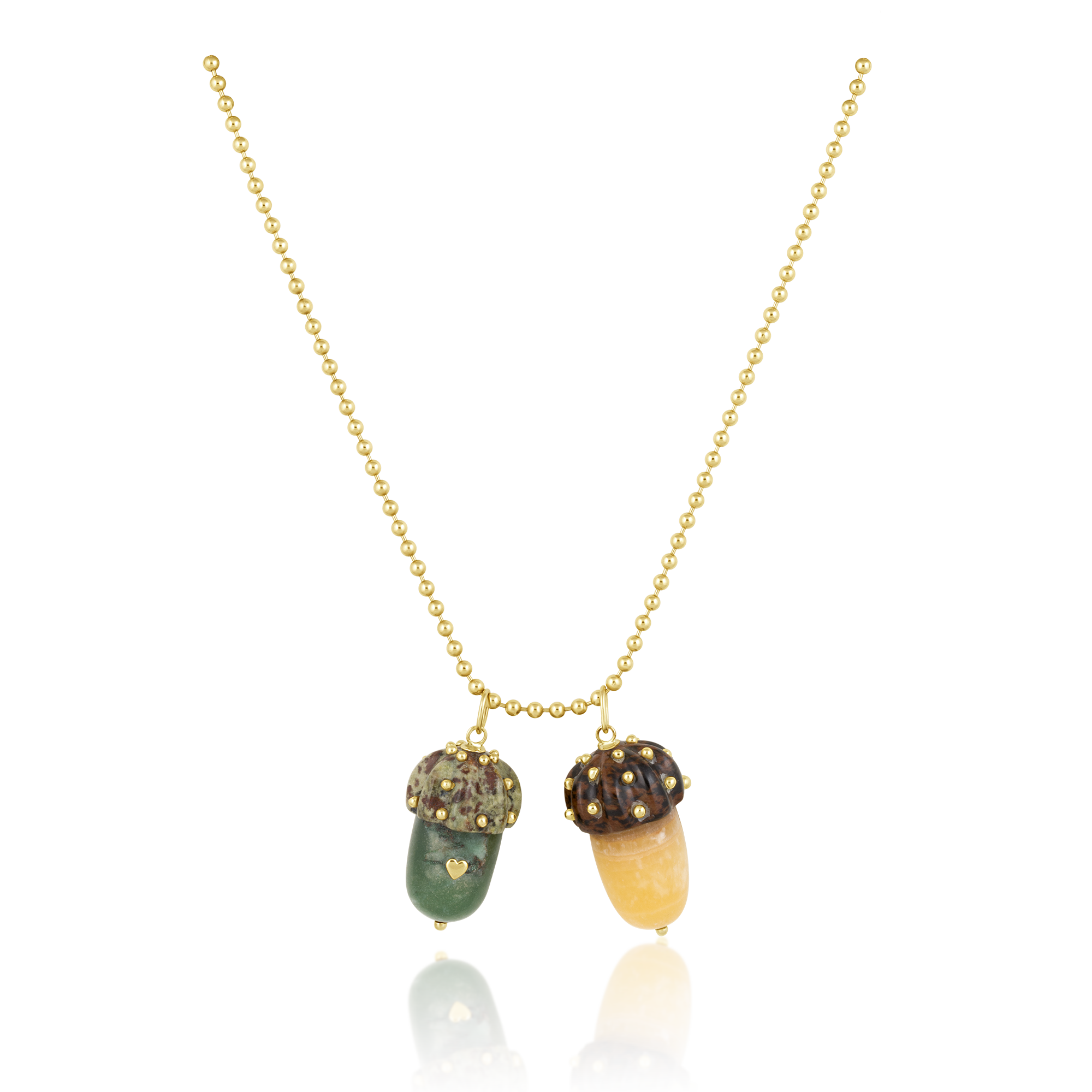 Hand-carved acorns in various stone combinations with gold balls and wire details; approximately 1.5” x 0.75”