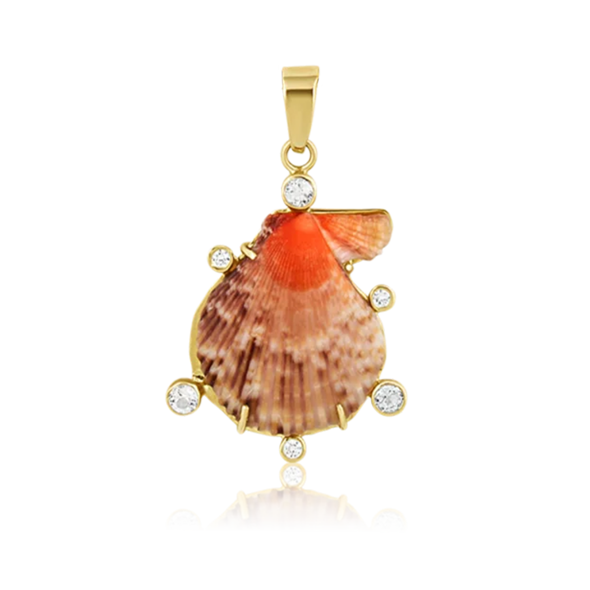 Orange/brown shell with halo of three 3mm white topaz and three VS+ man-made 2mm diamonds; full gold backing; handmade bail; 1" x 1.5"