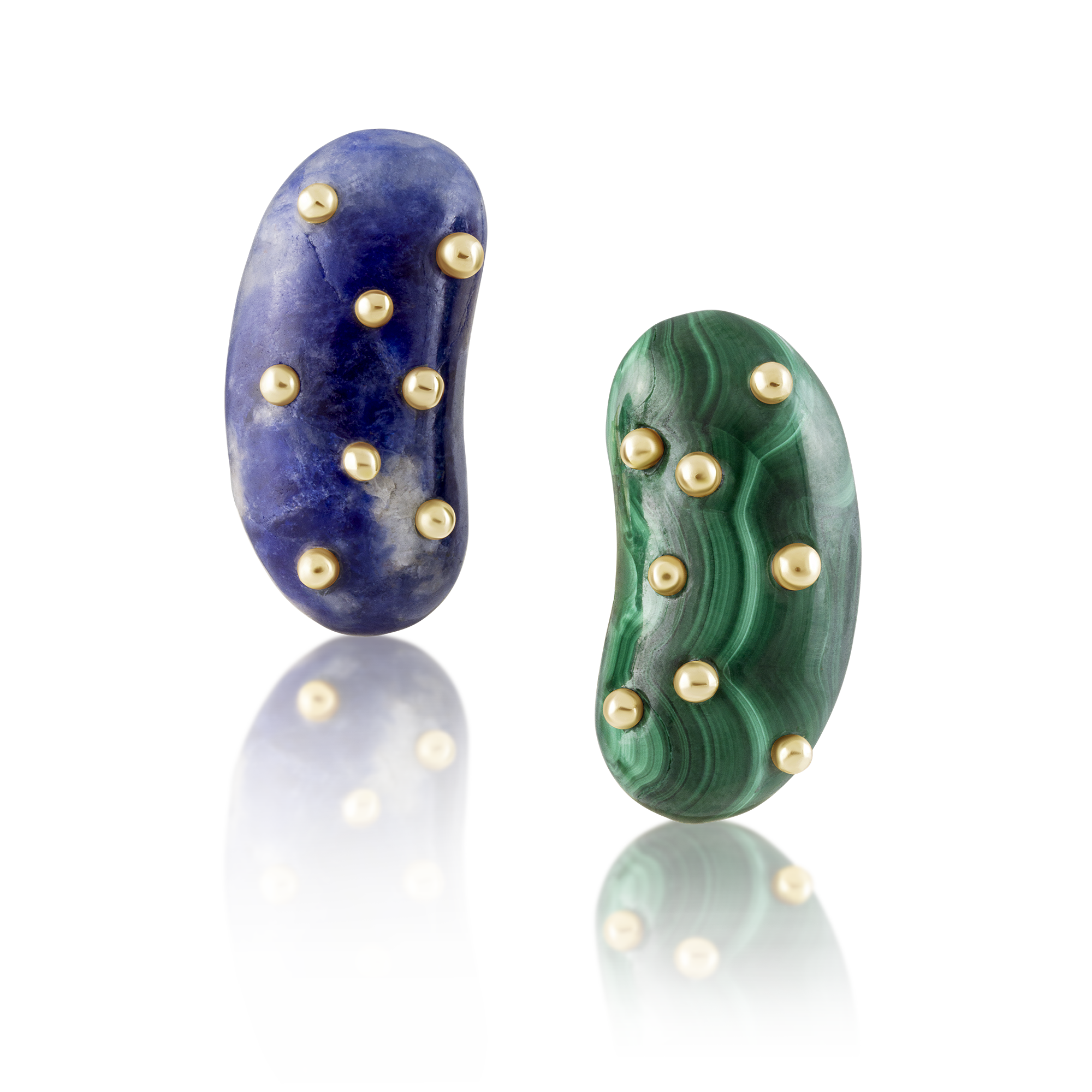 Hand-carved malachite and lapis bean earrings with gold balls and heart posts. Each measures 1" x 0.5" x 0.25" / br1106