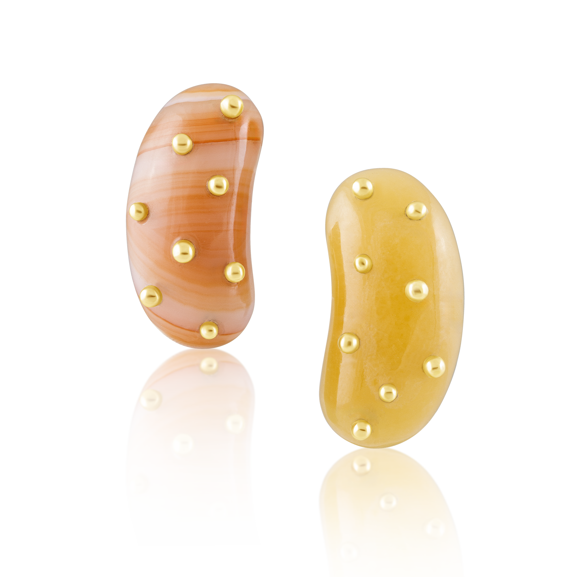 Hand-carved citrine and yellow onyx bean earrings with gold balls and heart posts. Each measures 1" x 0.5" x 0.25" / br1107