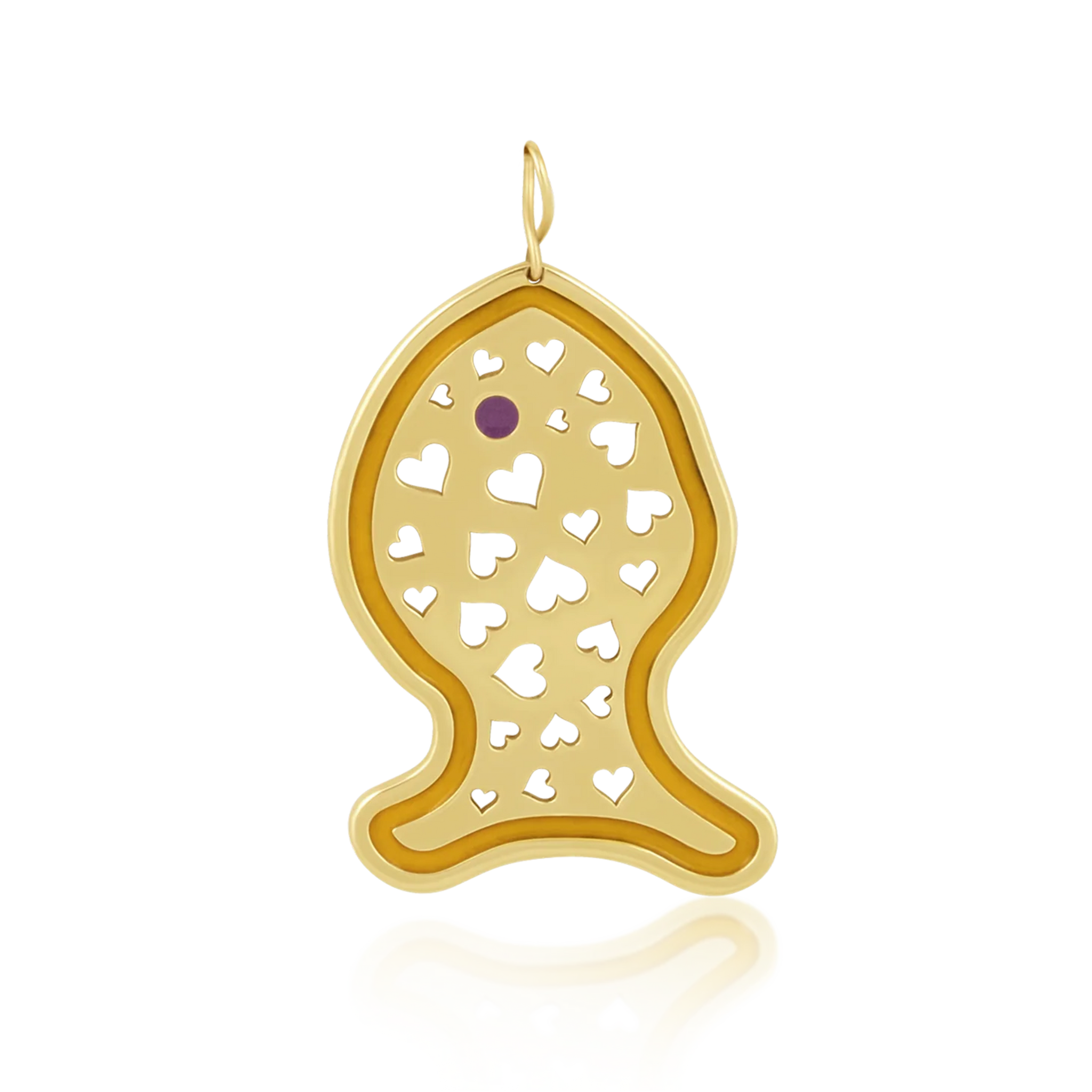 1.75" 14k gold large fish pendant with enamel and cutout hearts