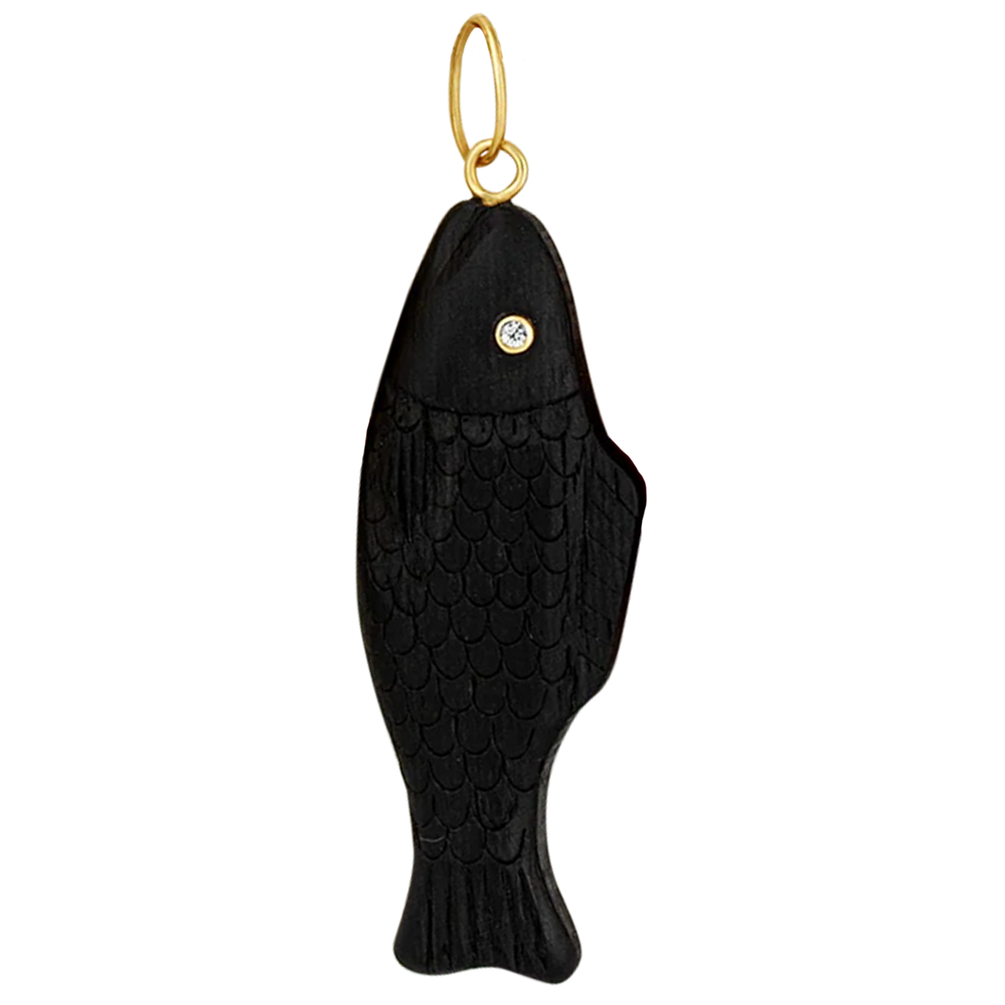 Hand-carved ebony "Swedish Fish" with white sapphire eye; gold heart on back; gold wire ring; 0.5" x 2.5"