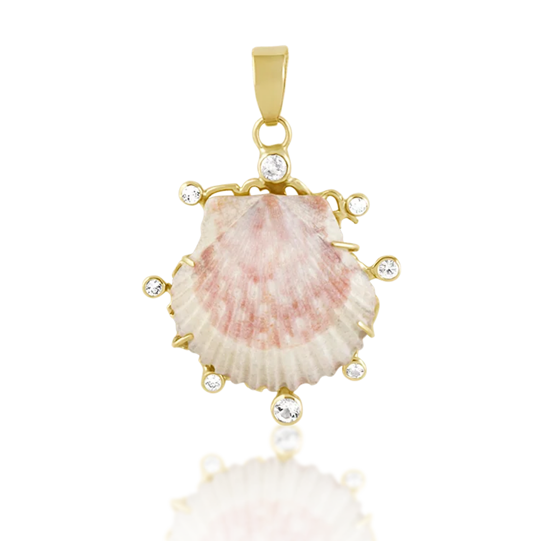 Light pink shell with halo of two 3mm white topaz, one 2.25mm white sapphire, three 2mm VS+ man-made diamonds, two 2.25mm white topaz; gold heart lattice backing; 1.75" x 1.25"