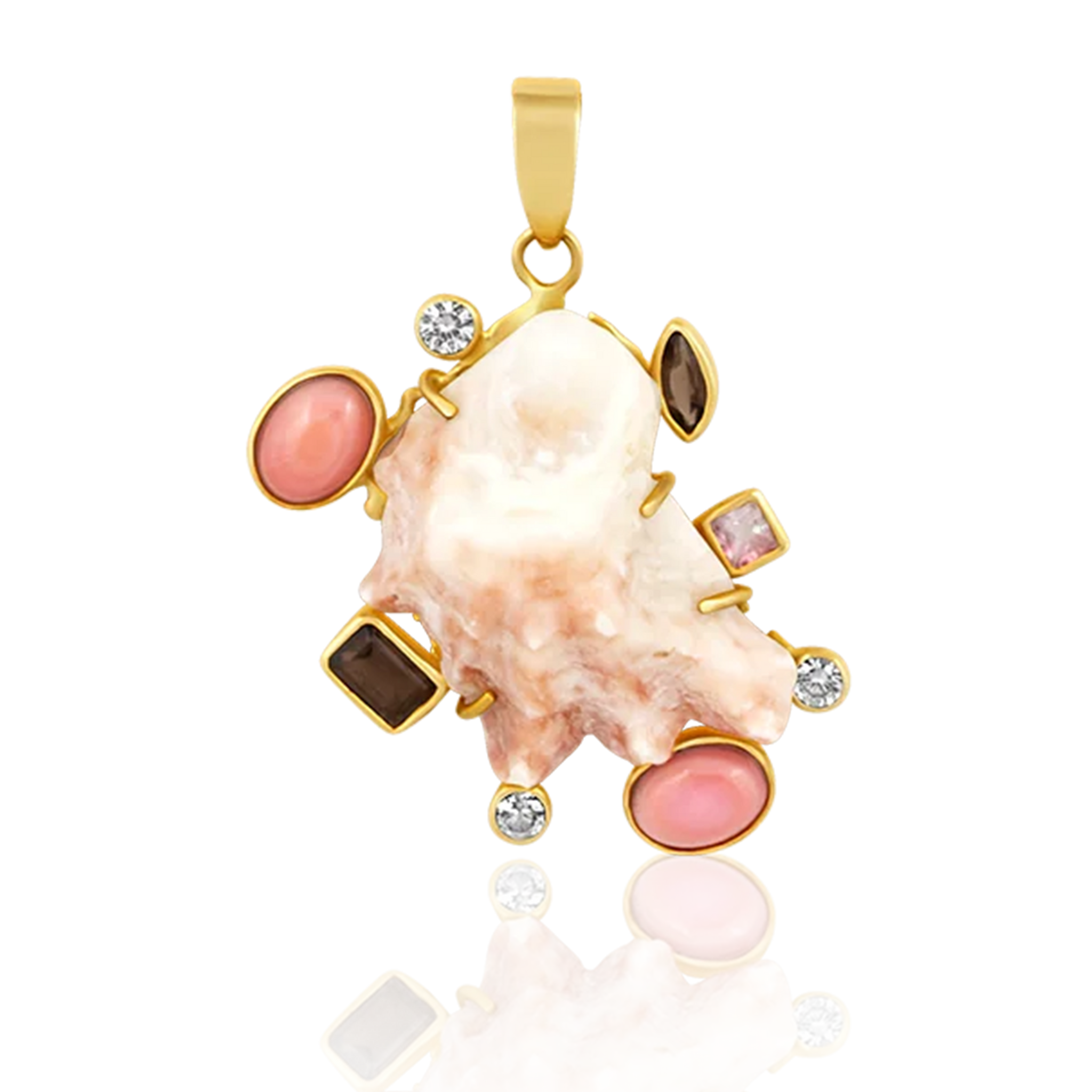 Lilac kitten paw with halo of carved pink conch shell cabochons, smoky quartz, pink topaz, and white sapphires; pink sapphire on back; handmade settings and bail; gold punched heart backing; 1.25" x 2"