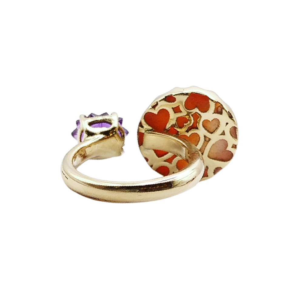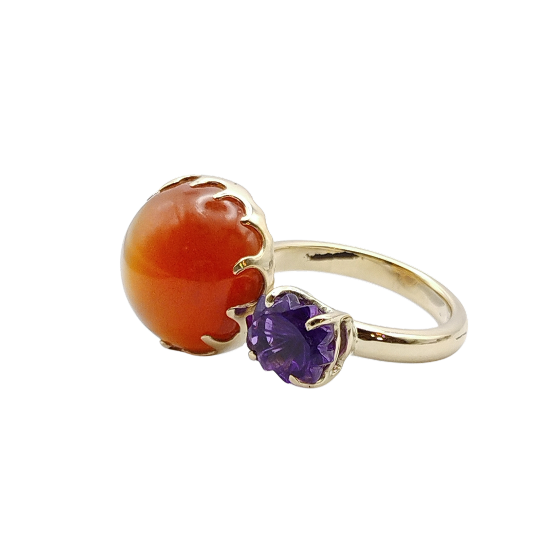 Carved carnelian agate Mars cabochon (0.75" diameter); 7x9mm oval star cut amethyst in handmade prong setting; gold heart lattice on back; ring size 7.5