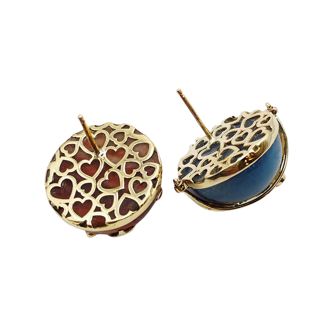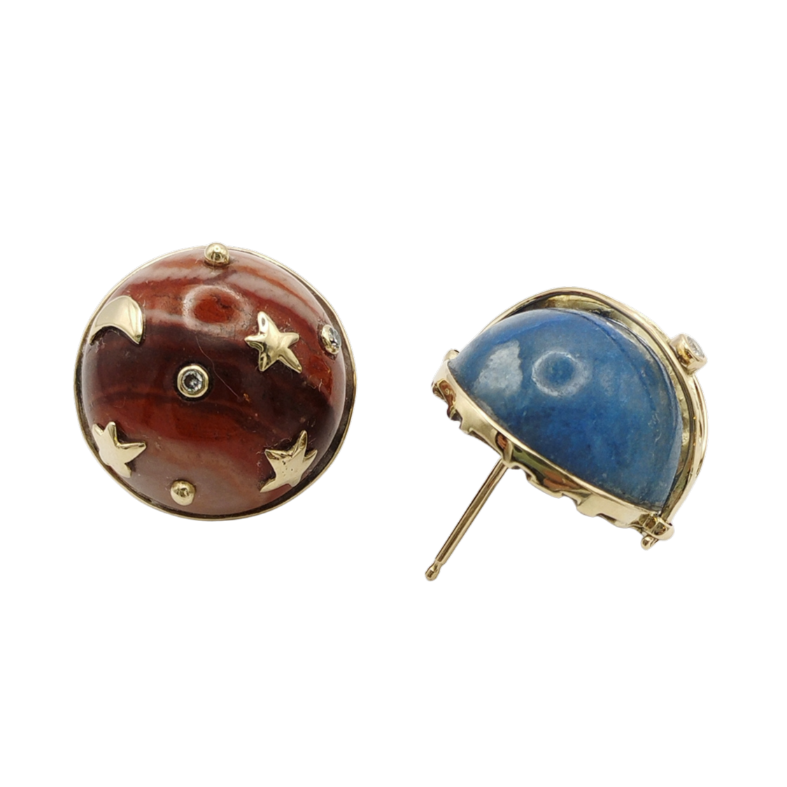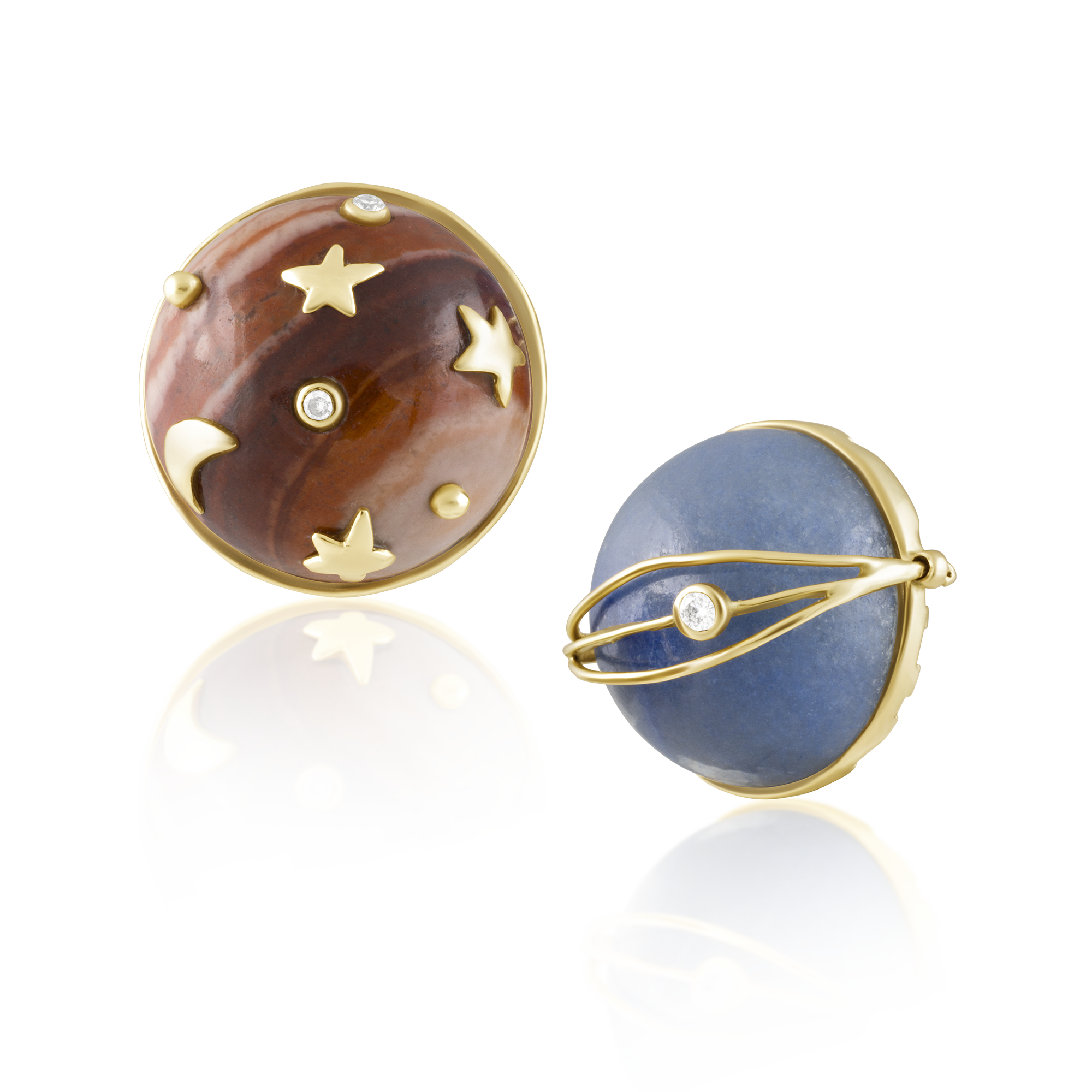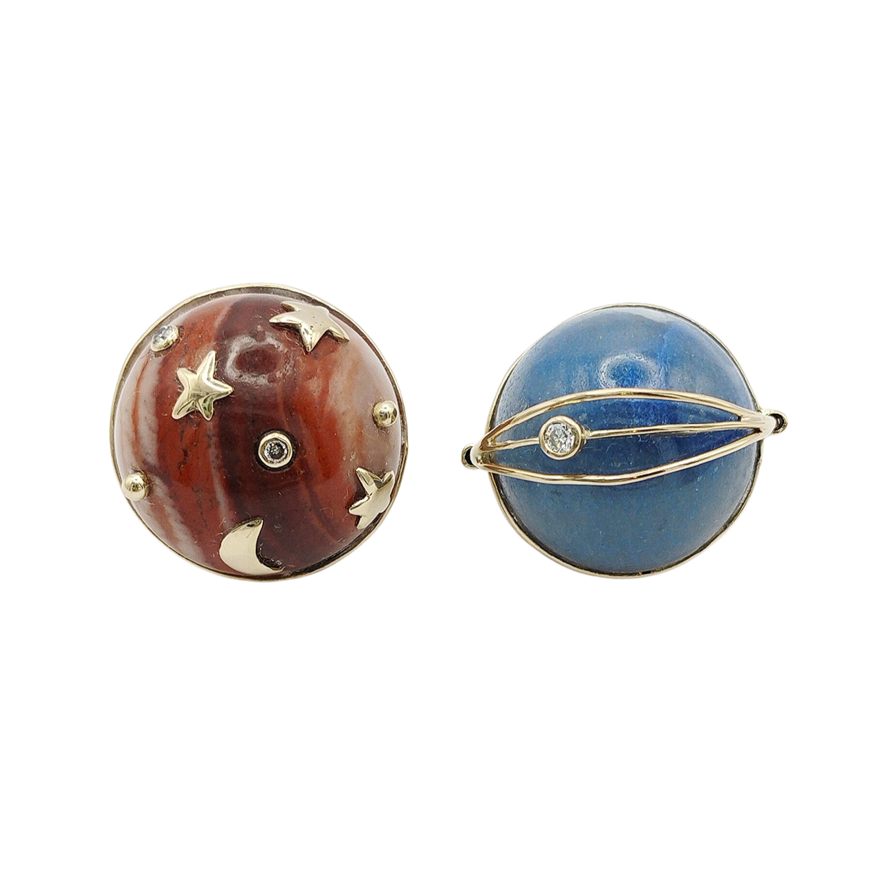 Carved stone cabochon earrings - Neptune (blue aventurine) has one 2mm VS+ manmade diamond and three gold rings; Venus (jicorita jasper) has two 1.75mm VS+ manmade diamonds, gold stars, and moon; each earring has gold bezel setting with heart lattice backing and post on back / 0.75" each