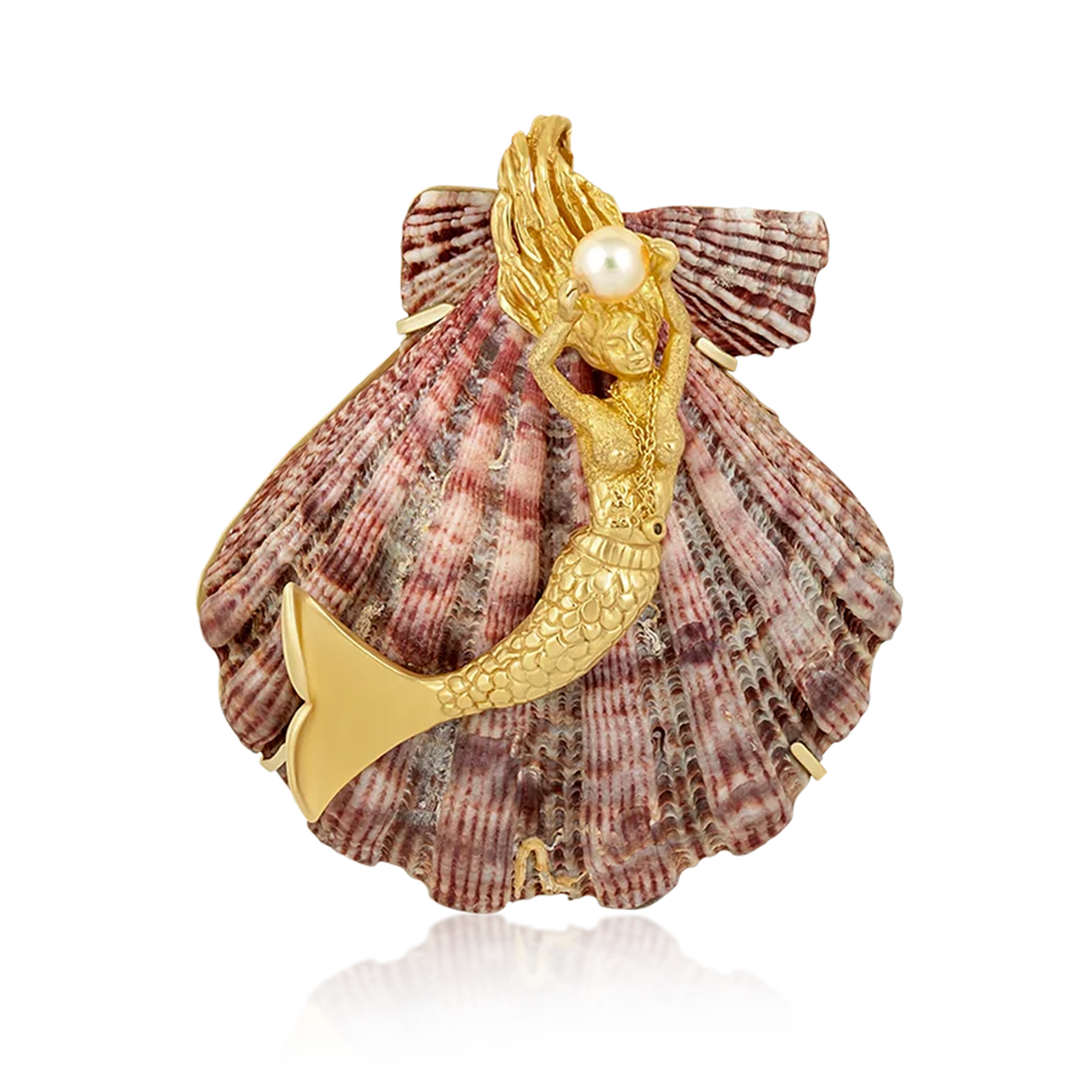 Large pink lion’s paw with 14k gold mermaid holding a pearl; full gold backing.