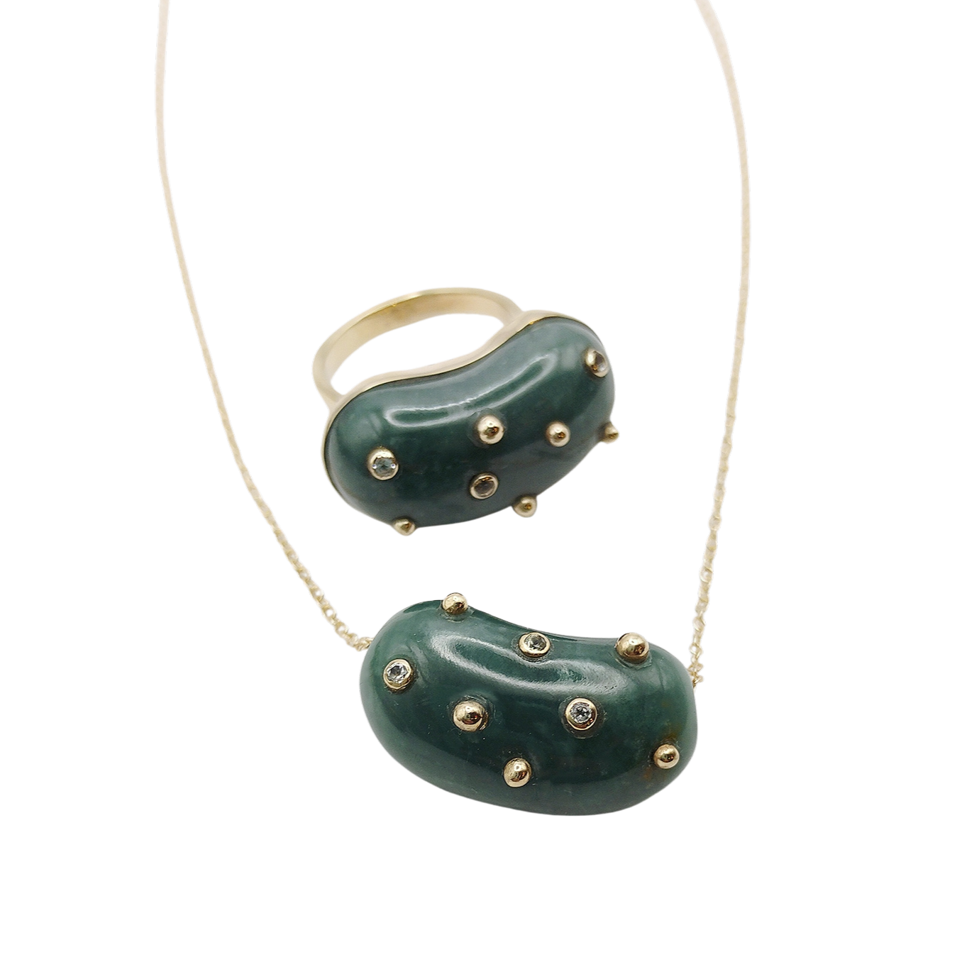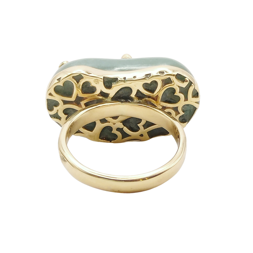 Carved jade bean studded with gold balls and three 1.75mm natural white sapphires (0.06 TCW); gold heart lattice on back; size 7.5; 3mm band; bean measures 1" x 0.5"
