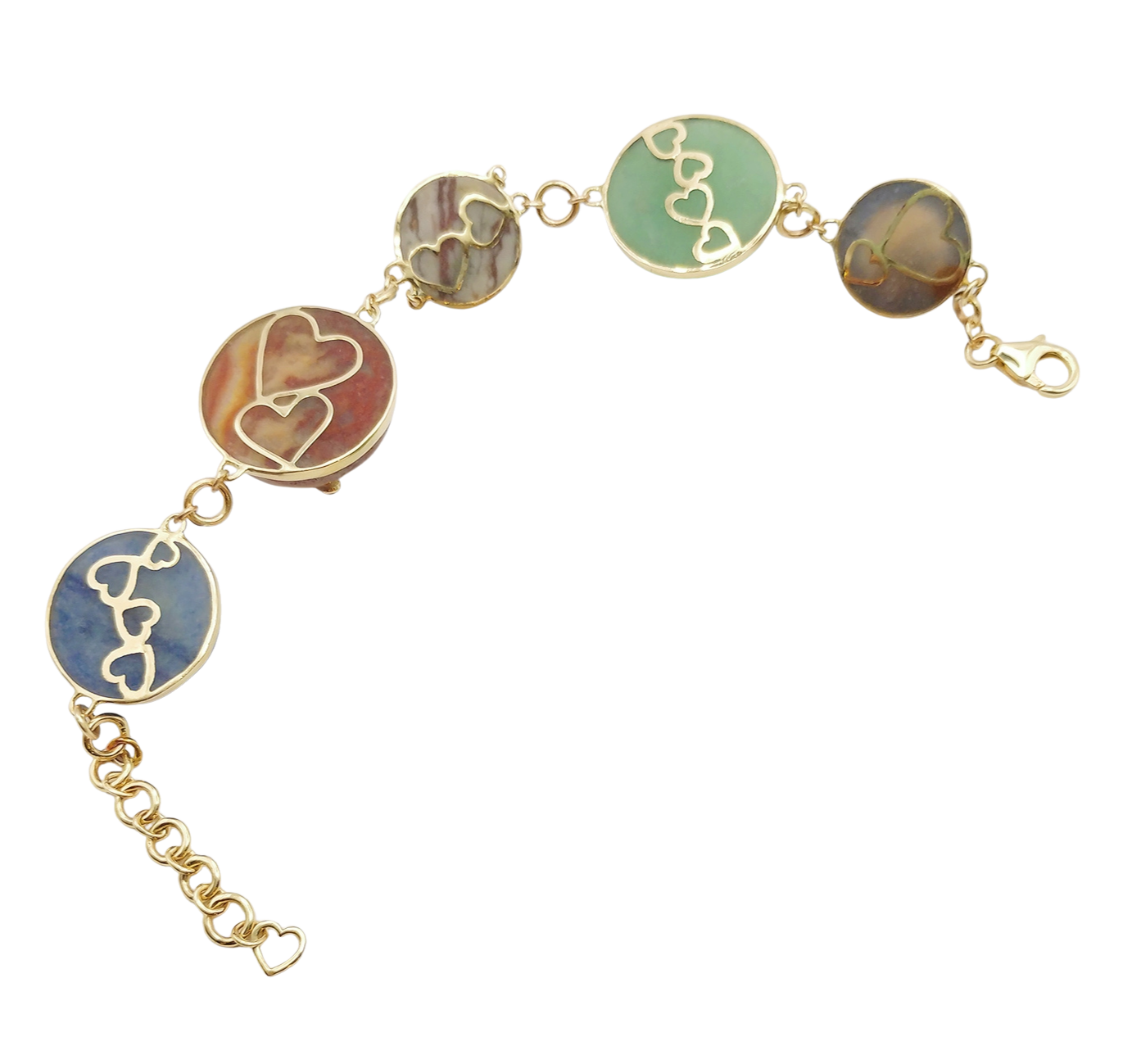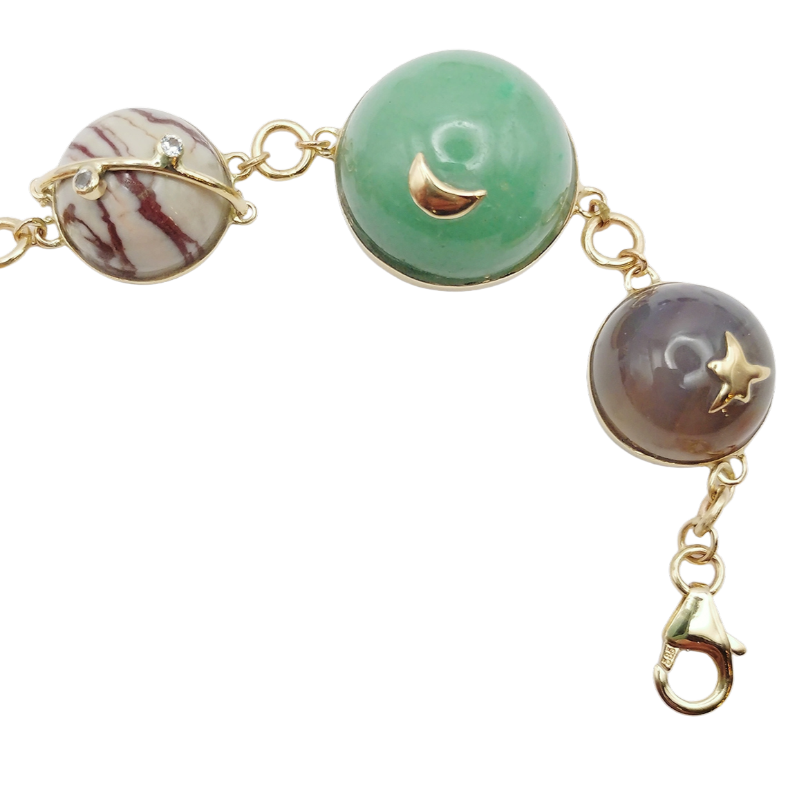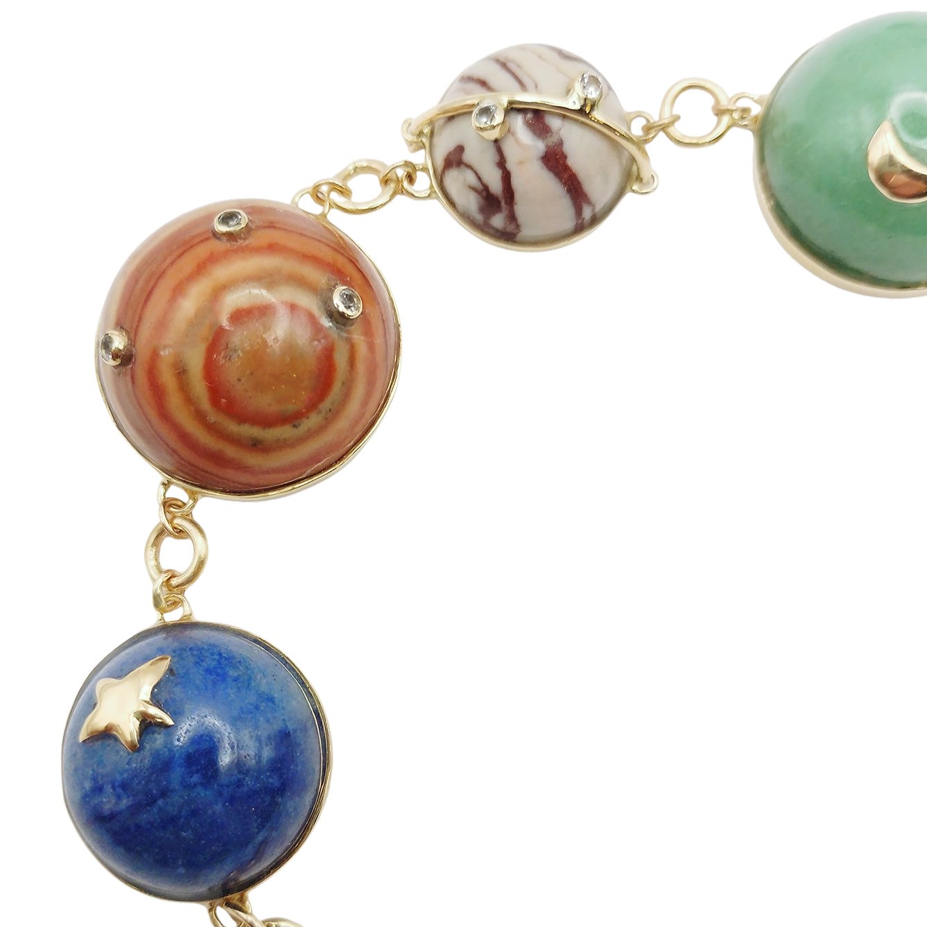Five hand-carved stone cabochons (sodalite, jicorite, jasper, green aventurine, agate) with gold stars, moons, rings, and white sapphires; handmade heart backing, settings, and chain; five 1.75mm natural white sapphires; 0.1 TCW; 7" long